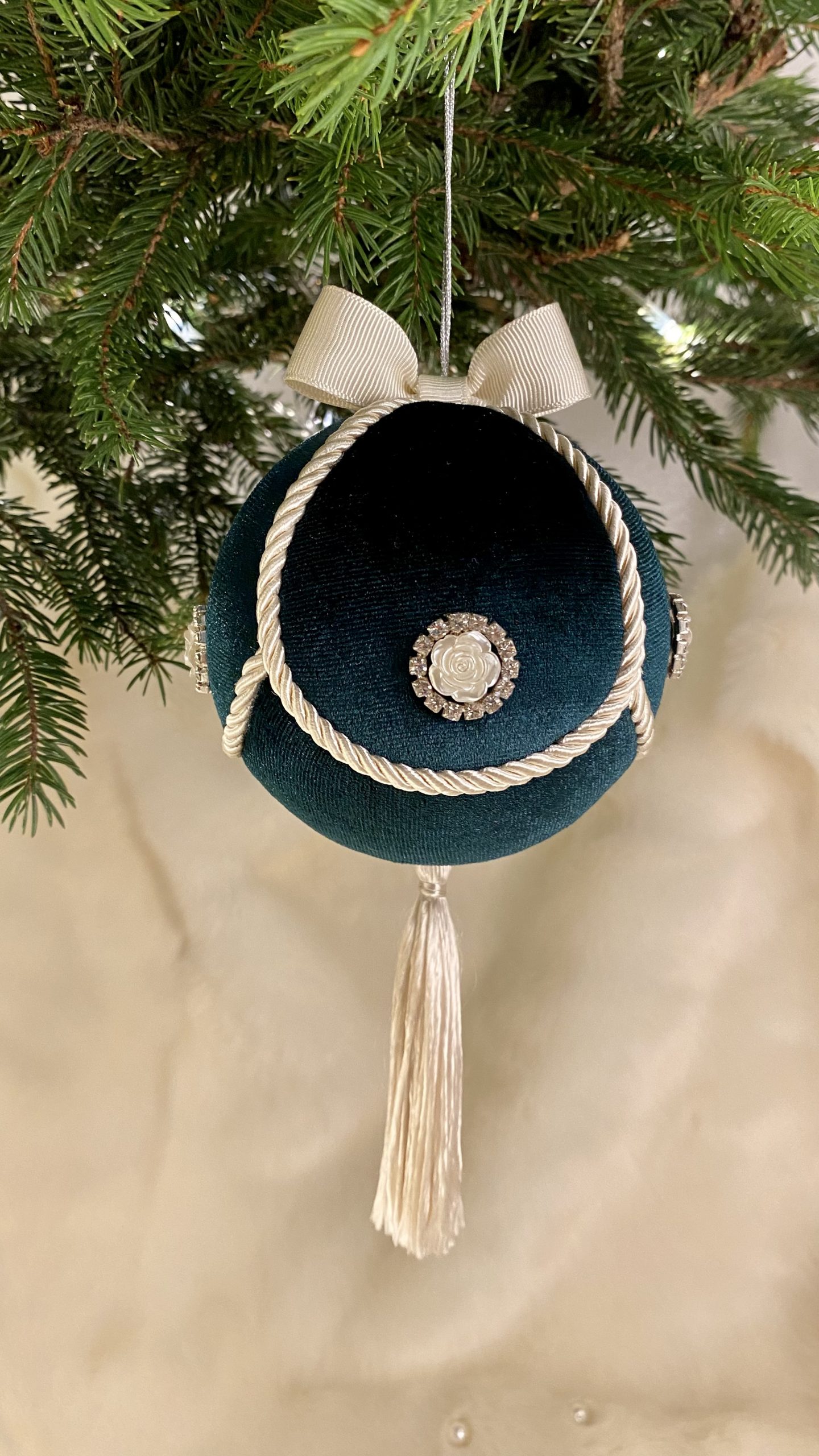 Culoare Nude/Verde/Argintiu, material textil înaltă calitate: catifea, cristale din sticlă și trandafiri perlați, fundă nude, ciucure mătase nude, dimensiuni 10x10x17 cm.