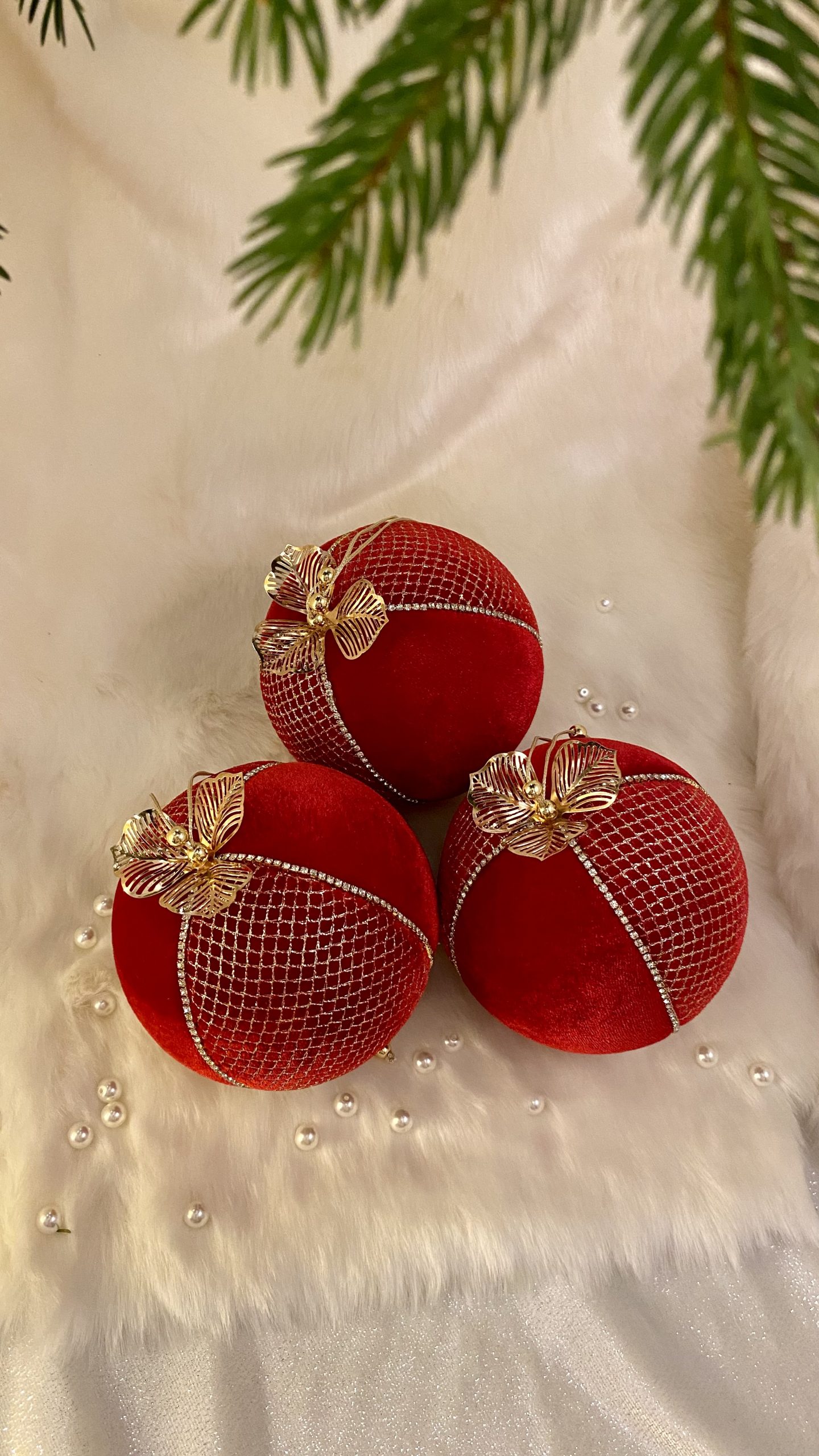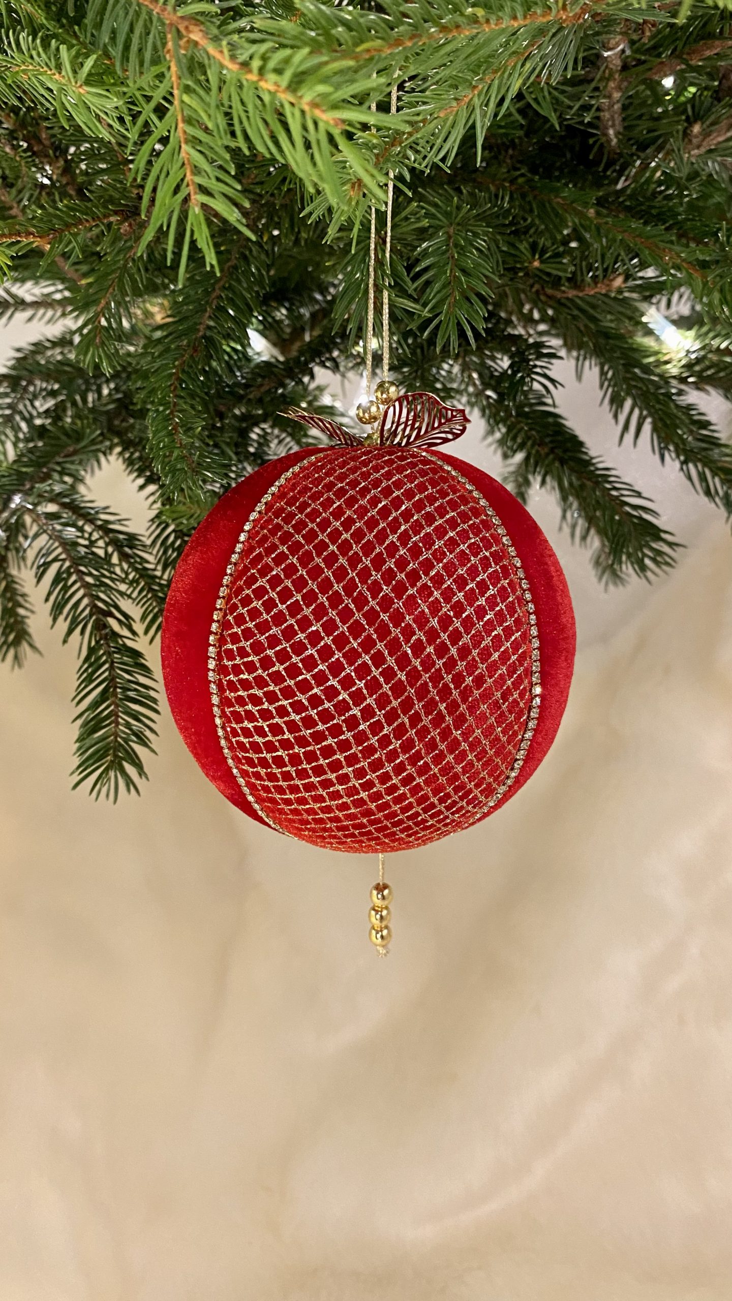 Culoare Roșu/Auriu, material textil înaltă calitate: catifea, cristale din sticlă, frunze metalice filigran aurii, ciucure din mărgele metalice aurii, dimensiuni 10x10x15 cm.