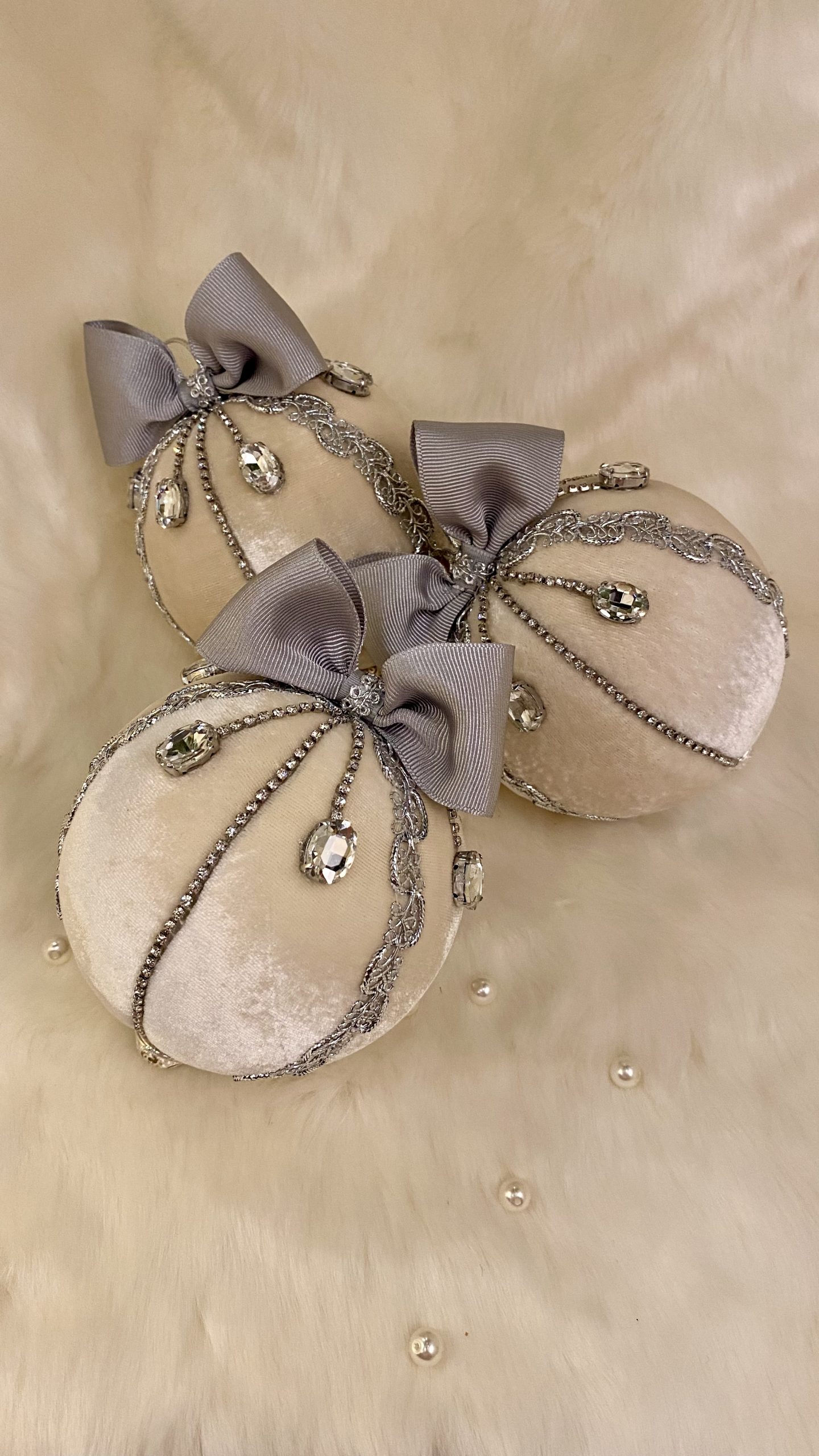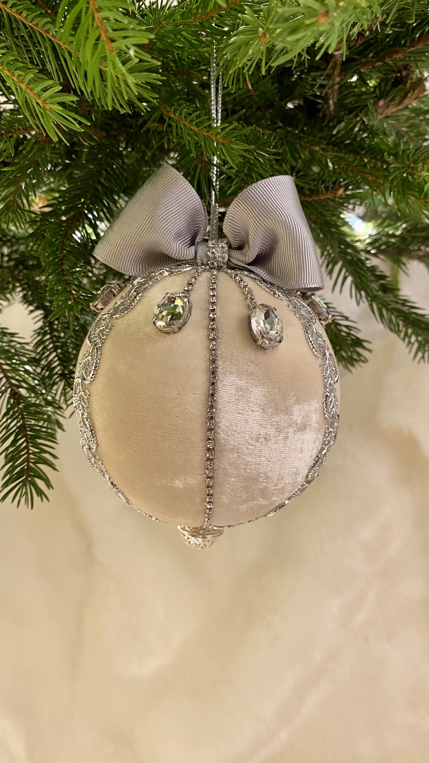 Culoare Nude/Gri/Argintiu, material textil înaltă calitate: catifea, cristale din sticlă, fundă gri, clopoțel argintiu filigran, dimensiuni 10x10x14 cm.
