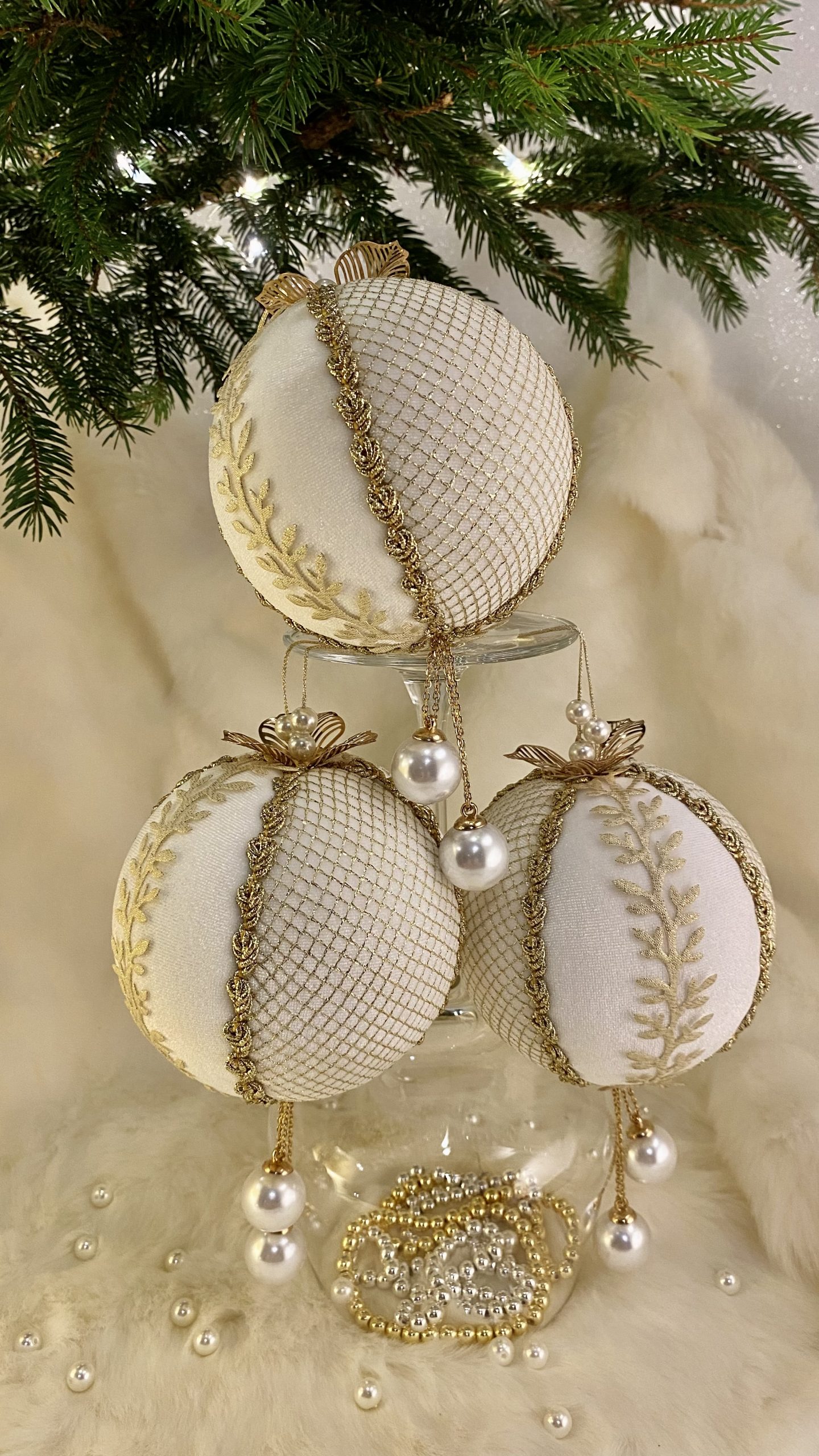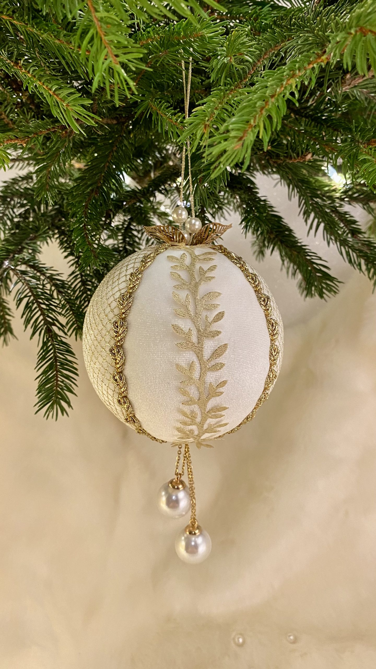 Culoare Alb/Auriu, material textil înaltă calitate: catifea, perle din sticlă, frunze metalice filigran aurii, ciucure din lant filigran cu perle, dimensiuni 10x10x17 cm.