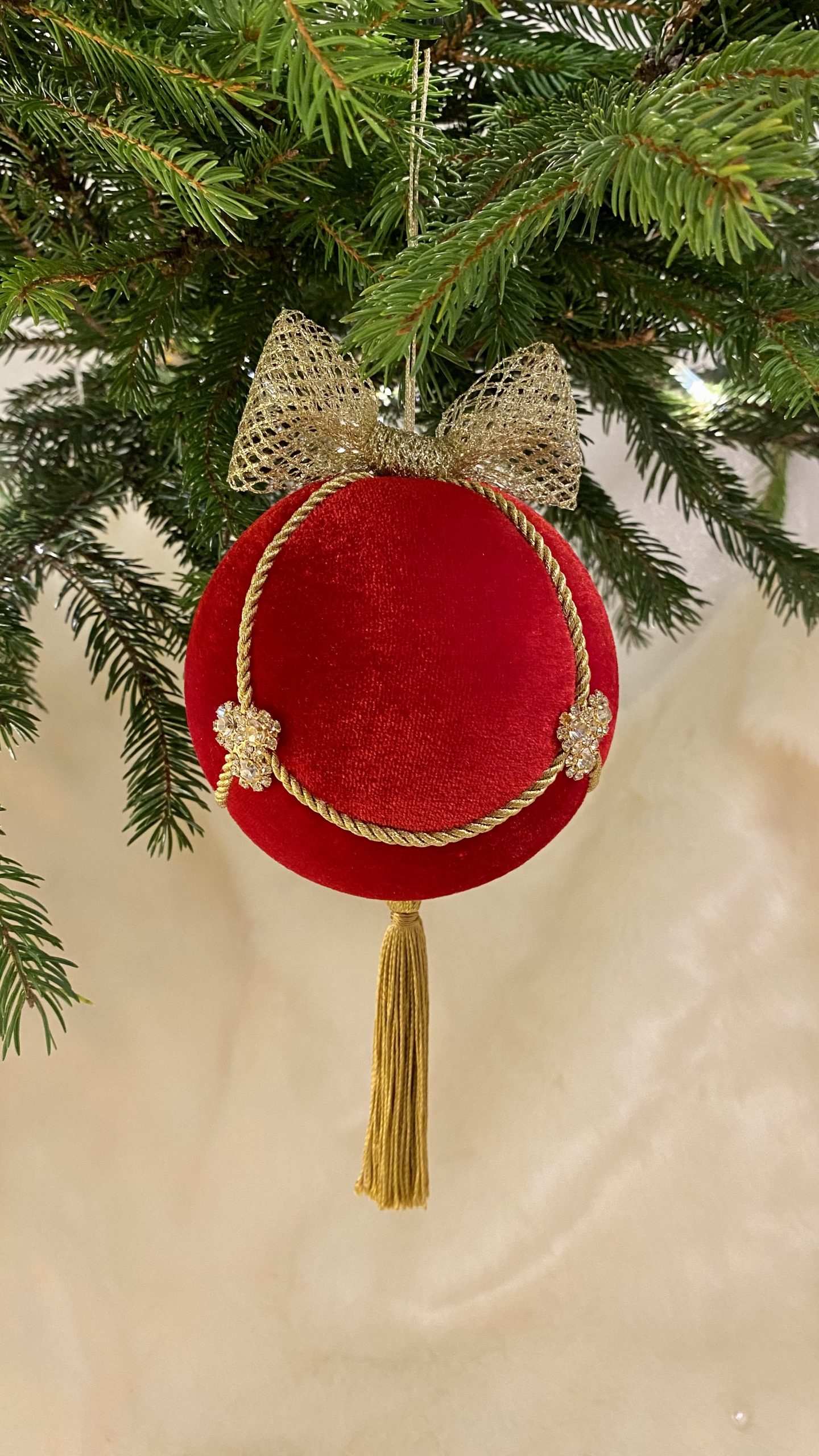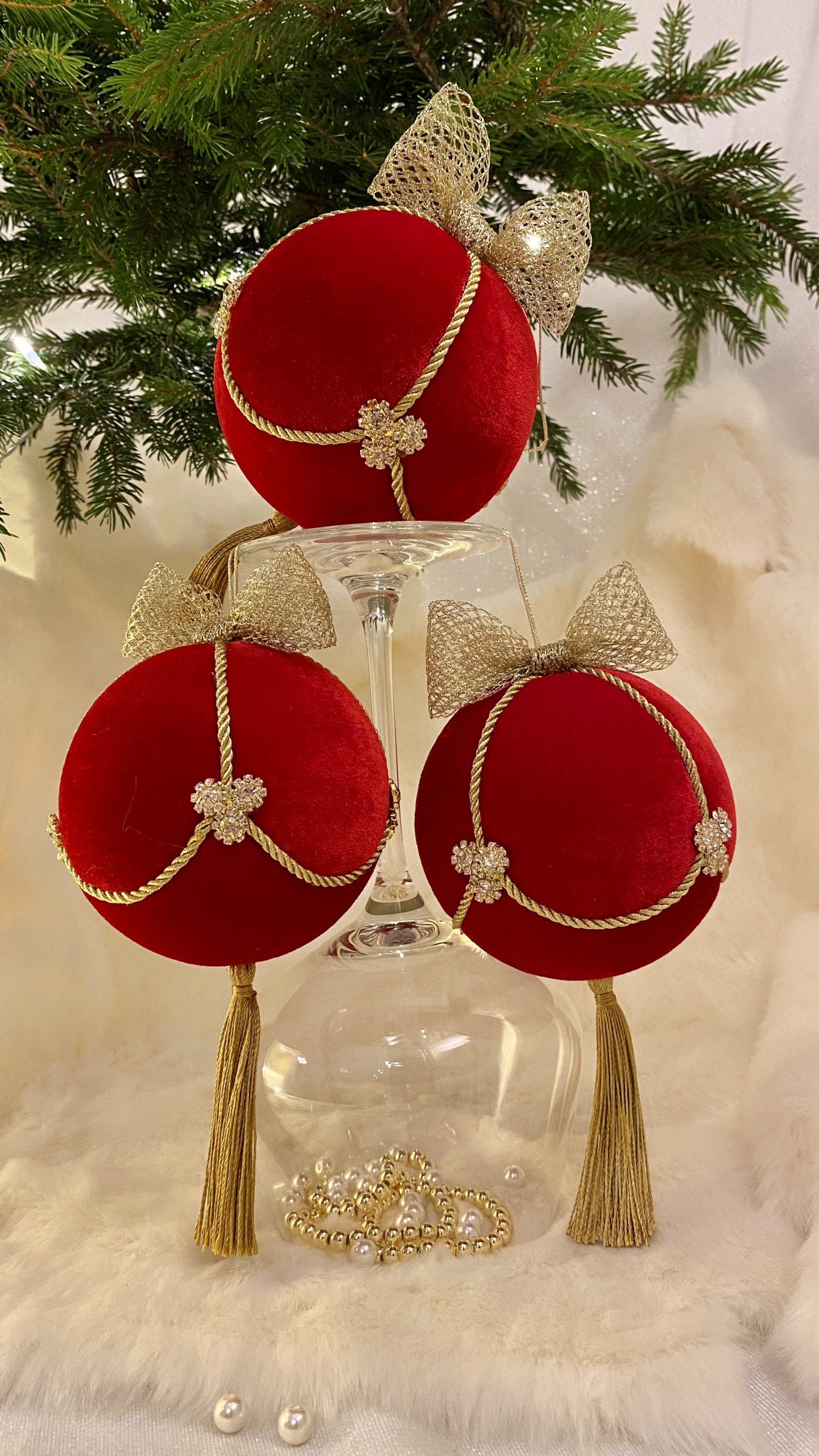 Culoare Roșu/Auriu, material textil înaltă calitate: catifea, cristale din sticlă, ciucure din mătase aurie, fundă din dantelă metalizată aurie, dimensiuni 10x10x17 cm.